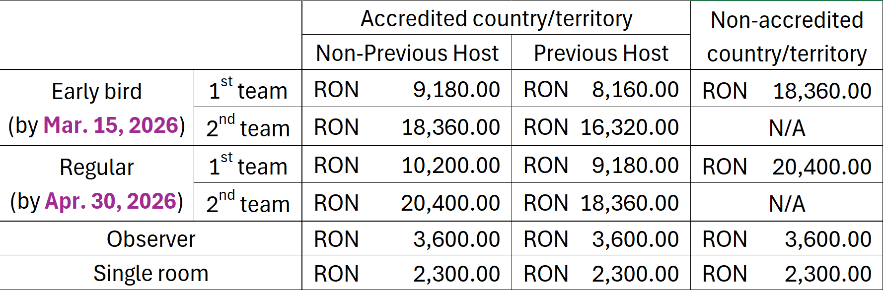 Late registration: registrations submitted after 30 April 2026 will incur an additional fee of 1000 RON per team, per month.